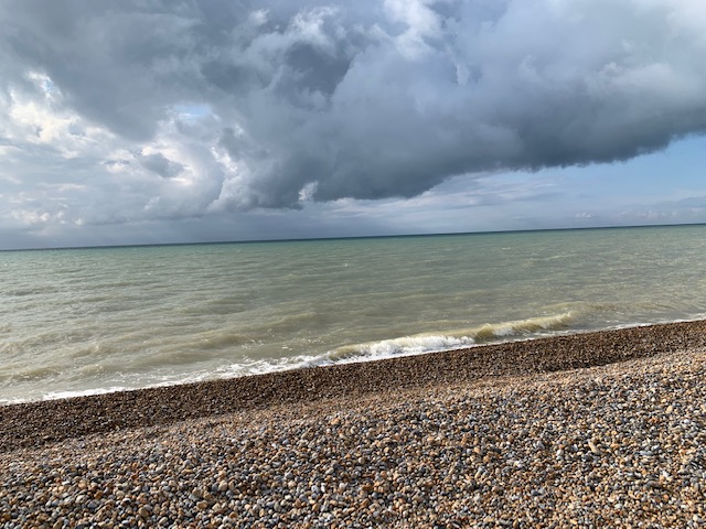 Setting off down the beach We slip and slide, On the slow, ancient tide of shells and stones That shifts beneath our feet. While puppet-string gulls Dance on the wind, And rod-and-arm ships line up astern against An early sky. Then hit our stride, piston legs Perfectly in time, The shingle making the sound of pulsing steam With every tread. Soon it is time to sit and eat, Catch our breath, While lazy teenage squalls skulk, late home From a night offshore. Each of us coveting the smooth Marbled pebbles, In our pockets, now cherished memories set free From here, for evermore. May 2022
